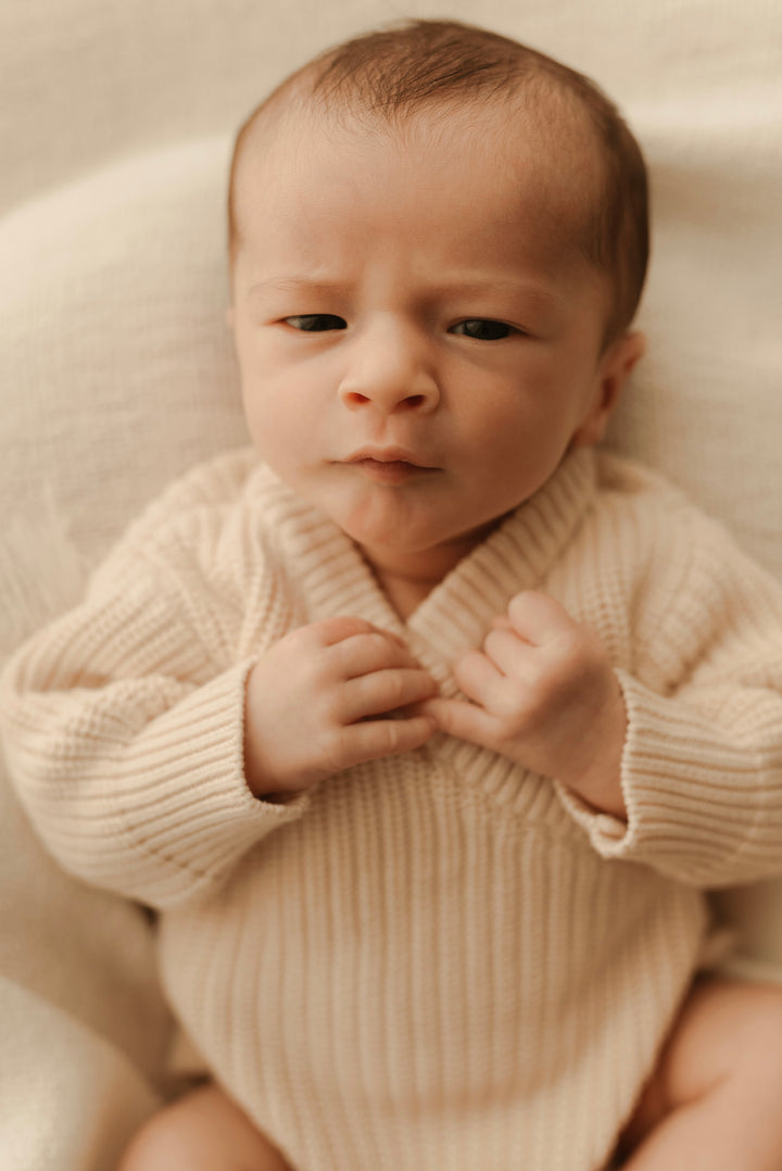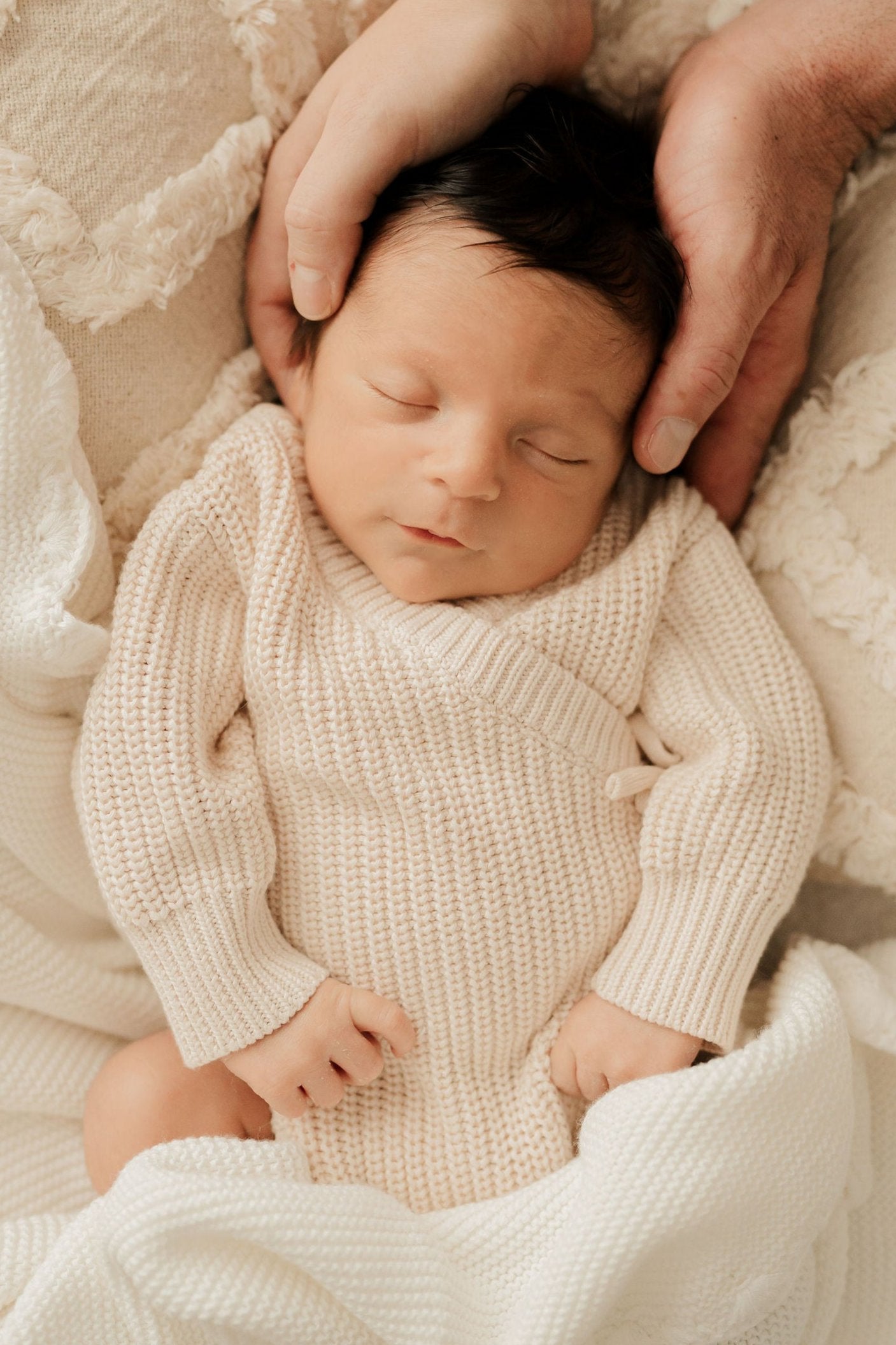 Sa coupe kimono permet un habillage tout en douceur, sans passer par la tête, grâce à des cordons discrets et des boutons-pression bien placés. Les teintes neutres et la texture subtile en font une pièce à la fois pratique et élégante, parfaite pour les journées douces à la maison comme pour les premières sorties.