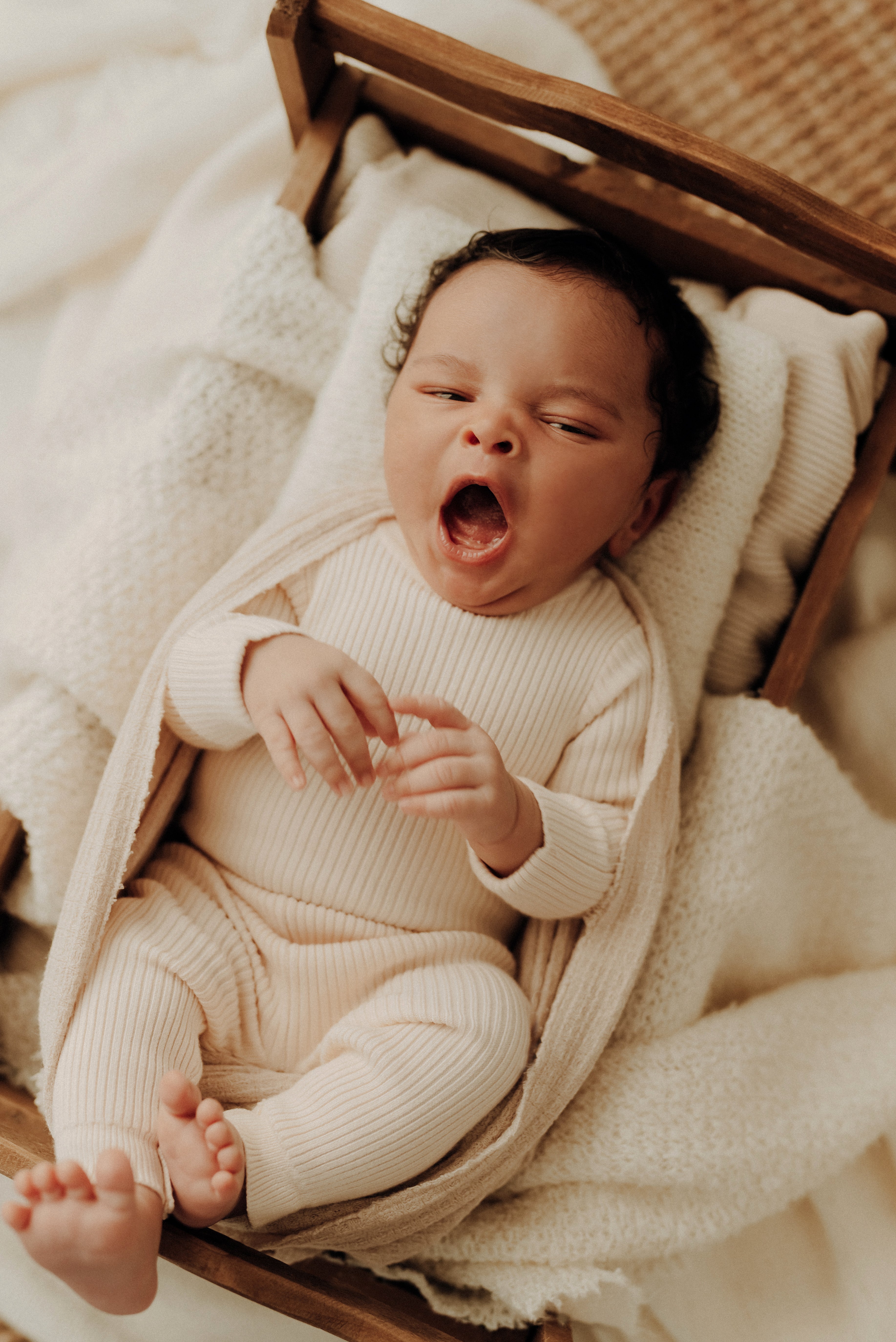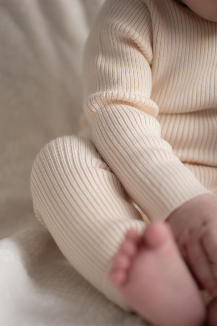 Son design côtelé ajoute une touche de texture moderne et élégante, tandis que la coupe ajustée garantit un maintien tout en confort. Le modèle nouveau-né est équipé de poches pour les mains intégrées, idéales pour éviter les petites égratignures.